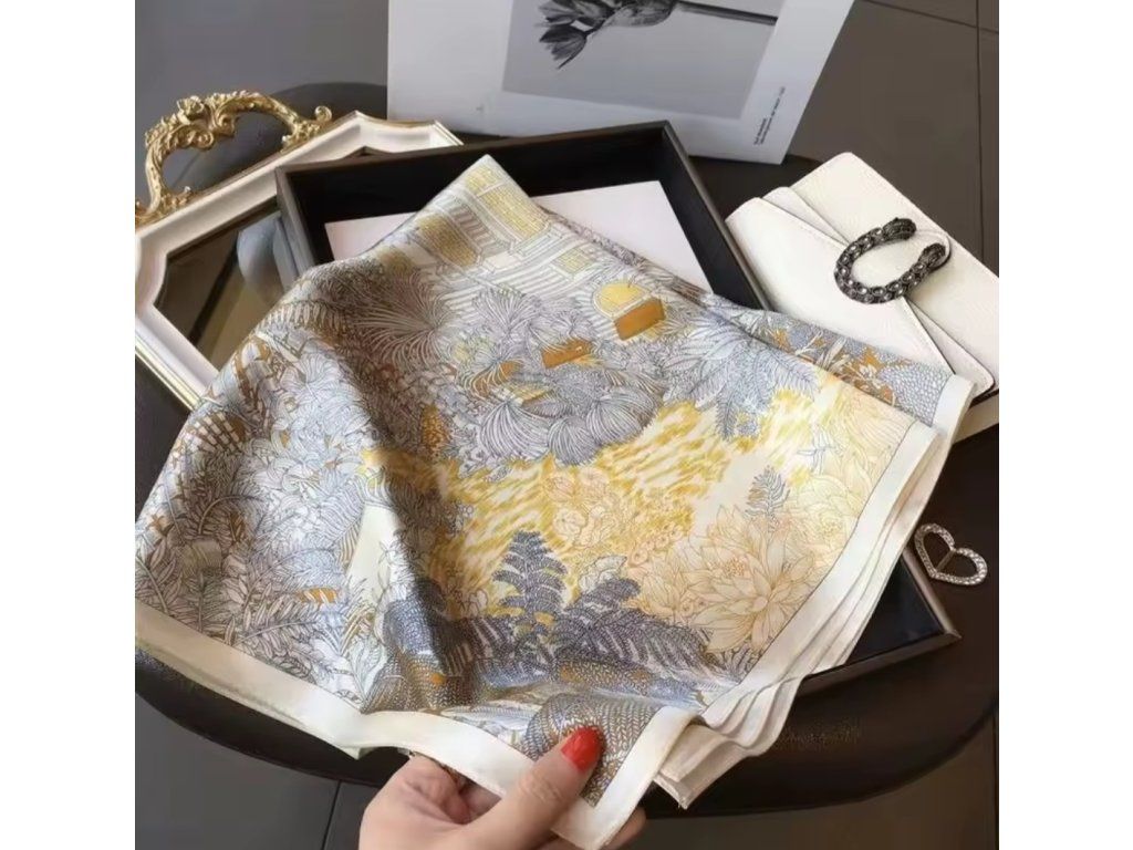 Anyaga: poliészter : „Selyemhatású luxusérzet, amit bátran viselhetsz a hétköznapokban is – nem gyűrődik, nem kényes, mégis lágy esésű és csodásan fénylik. Minden, amit a selyemtől vársz – kivéve a kényes kezelést. Lágy, nőies, mégis praktikus: az új kedvenc kendőd. Senki nem kérdezi, miből van – csak azt, honnan van.”