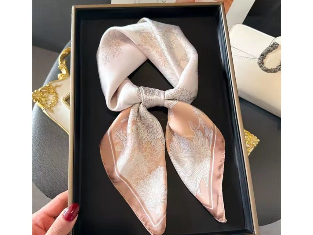 Anyaga: poliészter : „Selyemhatású luxusérzet, amit bátran viselhetsz a hétköznapokban is – nem gyűrődik, nem kényes, mégis lágy esésű és csodásan fénylik. Minden, amit a selyemtől vársz – kivéve a kényes kezelést. Lágy, nőies, mégis praktikus: az új kedvenc kendőd. Senki nem kérdezi, miből van – csak azt, honnan van.”