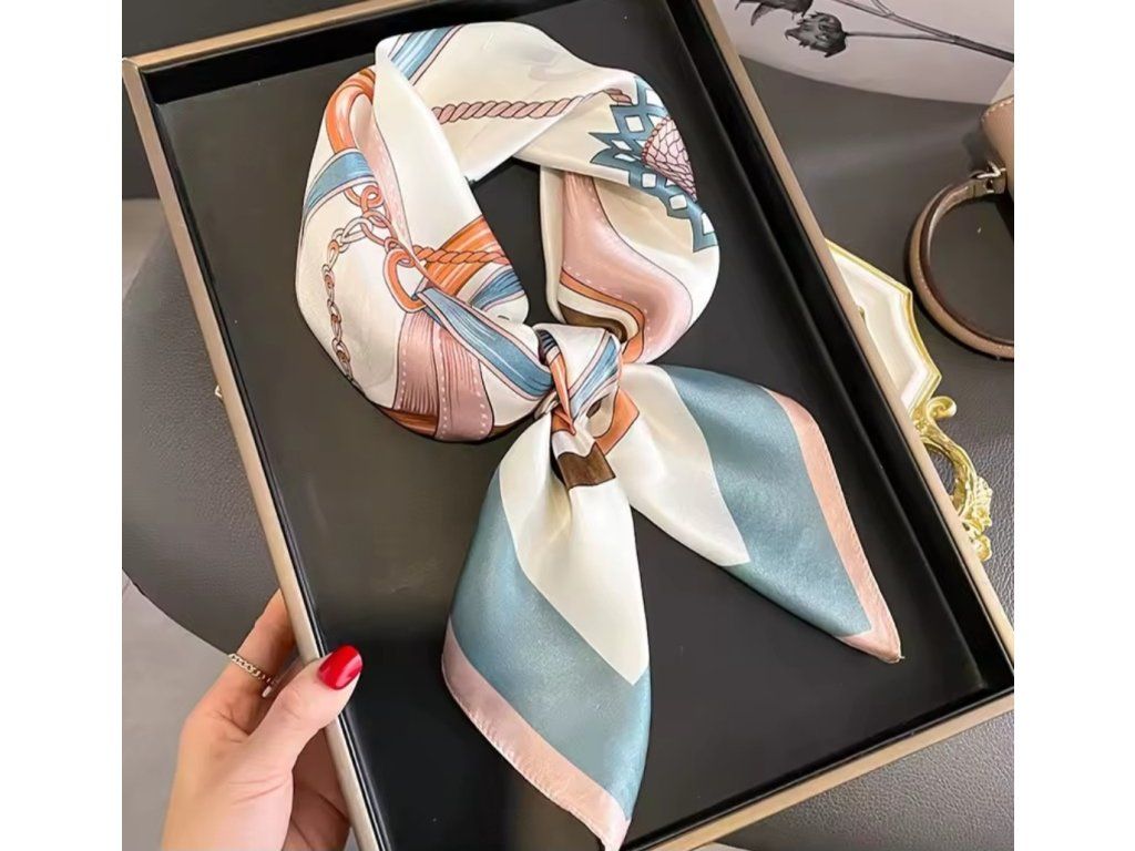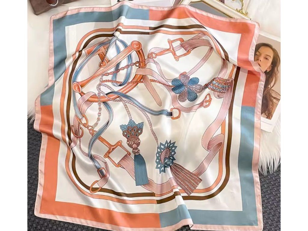 Anyaga: poliészter : „Selyemhatású luxusérzet, amit bátran viselhetsz a hétköznapokban is – nem gyűrődik, nem kényes, mégis lágy esésű és csodásan fénylik. Minden, amit a selyemtől vársz – kivéve a kényes kezelést. Lágy, nőies, mégis praktikus: az új kedvenc kendőd. Senki nem kérdezi, miből van – csak azt, honnan van.”