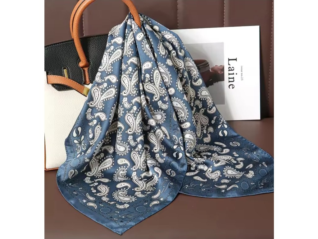 Anyaga: poliészter : „Selyemhatású luxusérzet, amit bátran viselhetsz a hétköznapokban is – nem gyűrődik, nem kényes, mégis lágy esésű és csodásan fénylik. Minden, amit a selyemtől vársz – kivéve a kényes kezelést. Lágy, nőies, mégis praktikus: az új kedvenc kendőd. Senki nem kérdezi, miből van – csak azt, honnan van.”