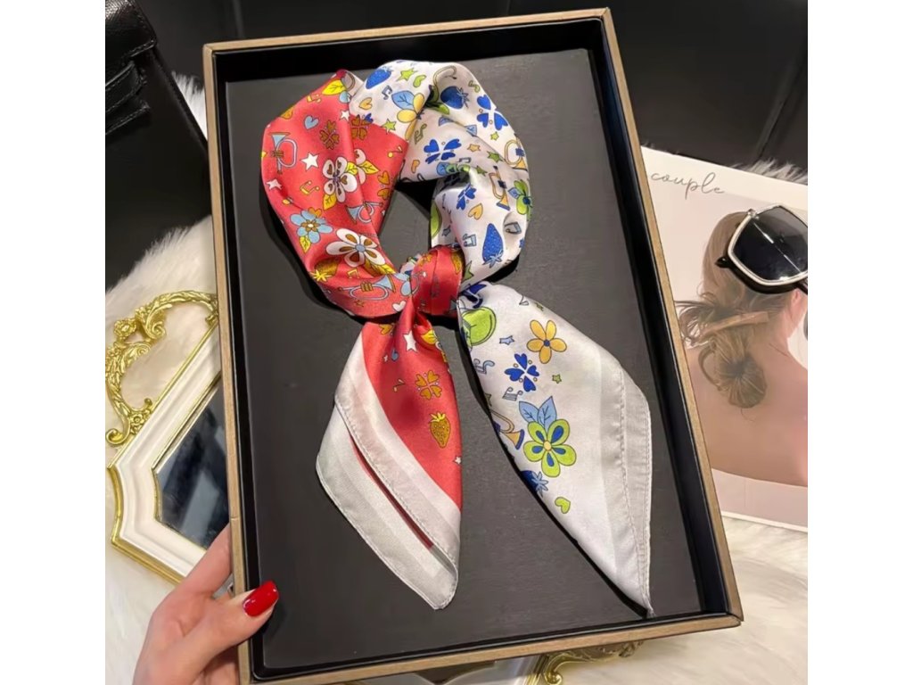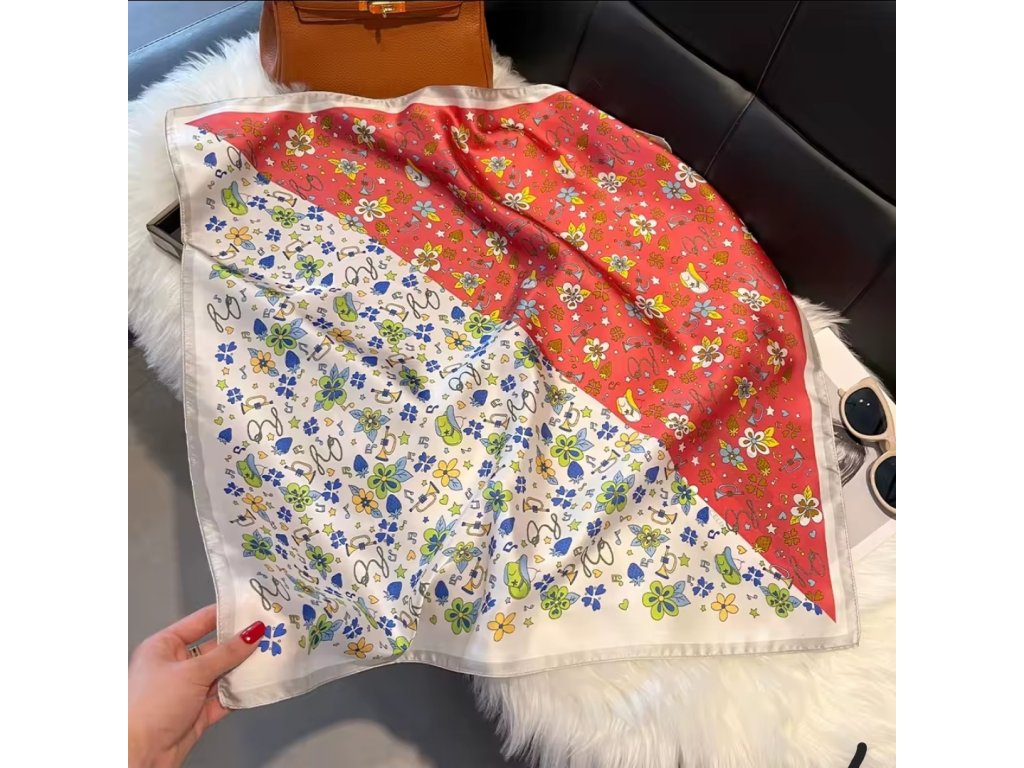 Anyaga: poliészter : „Selyemhatású luxusérzet, amit bátran viselhetsz a hétköznapokban is – nem gyűrődik, nem kényes, mégis lágy esésű és csodásan fénylik. Minden, amit a selyemtől vársz – kivéve a kényes kezelést. Lágy, nőies, mégis praktikus: az új kedvenc kendőd. Senki nem kérdezi, miből van – csak azt, honnan van.”