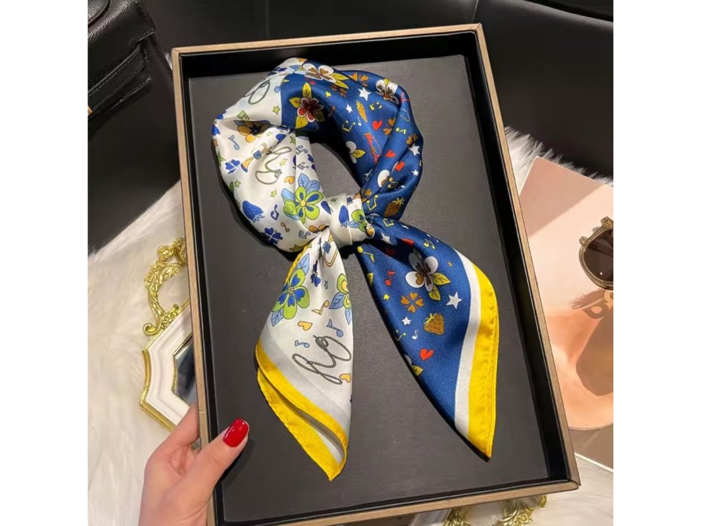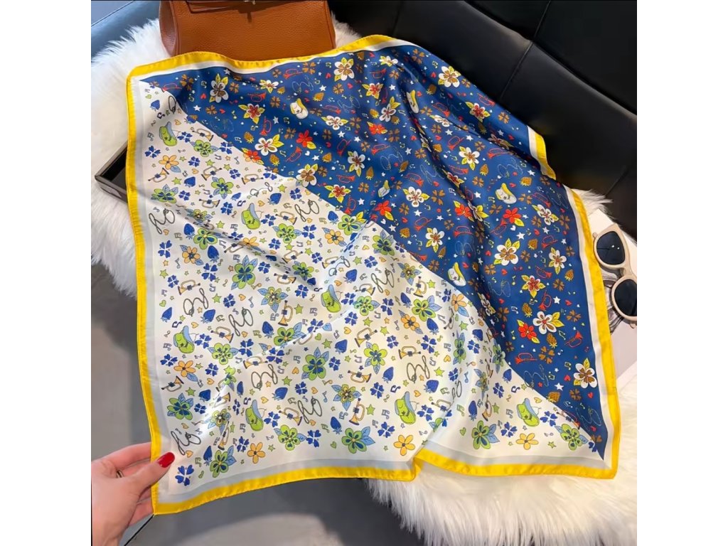 Anyaga: poliészter : „Selyemhatású luxusérzet, amit bátran viselhetsz a hétköznapokban is – nem gyűrődik, nem kényes, mégis lágy esésű és csodásan fénylik. Minden, amit a selyemtől vársz – kivéve a kényes kezelést. Lágy, nőies, mégis praktikus: az új kedvenc kendőd. Senki nem kérdezi, miből van – csak azt, honnan van.”