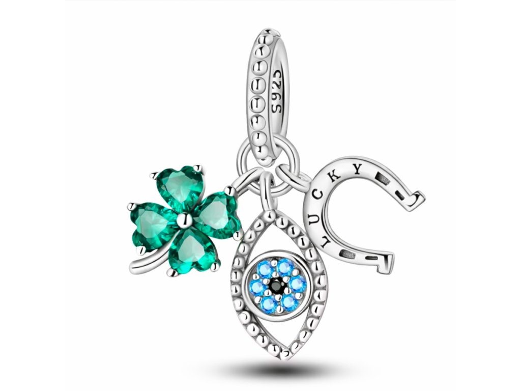 Háromszoros szerencse egyetlen charmba zárva – lóhere, patkó és védelmező szem.