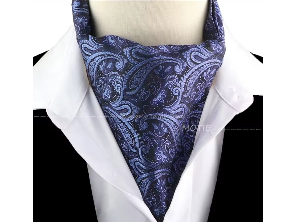 Elegáns, sötétkék ascot sál gazdag paisley mintával – stílusos választás minden alkalomra.
