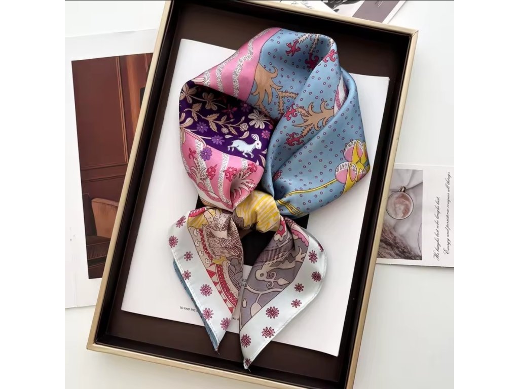 Anyaga: poliészter : „Selyemhatású luxusérzet, amit bátran viselhetsz a hétköznapokban is – nem gyűrődik, nem kényes, mégis lágy esésű és csodásan fénylik. Minden, amit a selyemtől vársz – kivéve a kényes kezelést. Lágy, nőies, mégis praktikus: az új kedvenc kendőd. Senki nem kérdezi, miből van – csak azt, honnan van.”