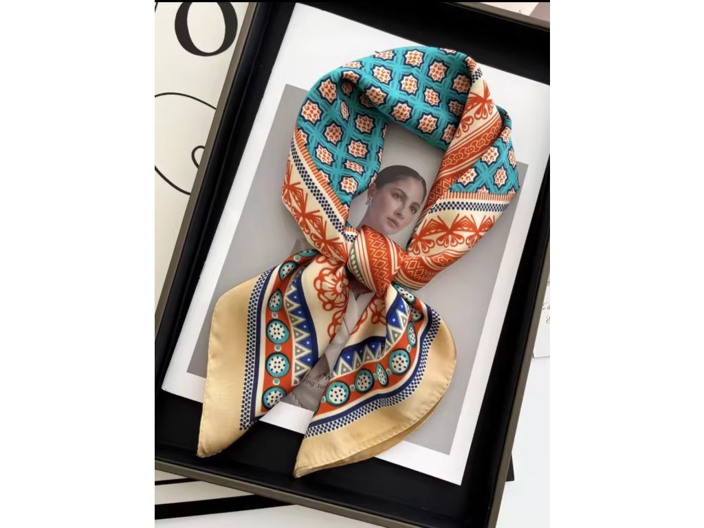 Anyaga: poliészter : „Selyemhatású luxusérzet, amit bátran viselhetsz a hétköznapokban is – nem gyűrődik, nem kényes, mégis lágy esésű és csodásan fénylik. Minden, amit a selyemtől vársz – kivéve a kényes kezelést. Lágy, nőies, mégis praktikus: az új kedvenc kendőd. Senki nem kérdezi, miből van – csak azt, honnan van.”